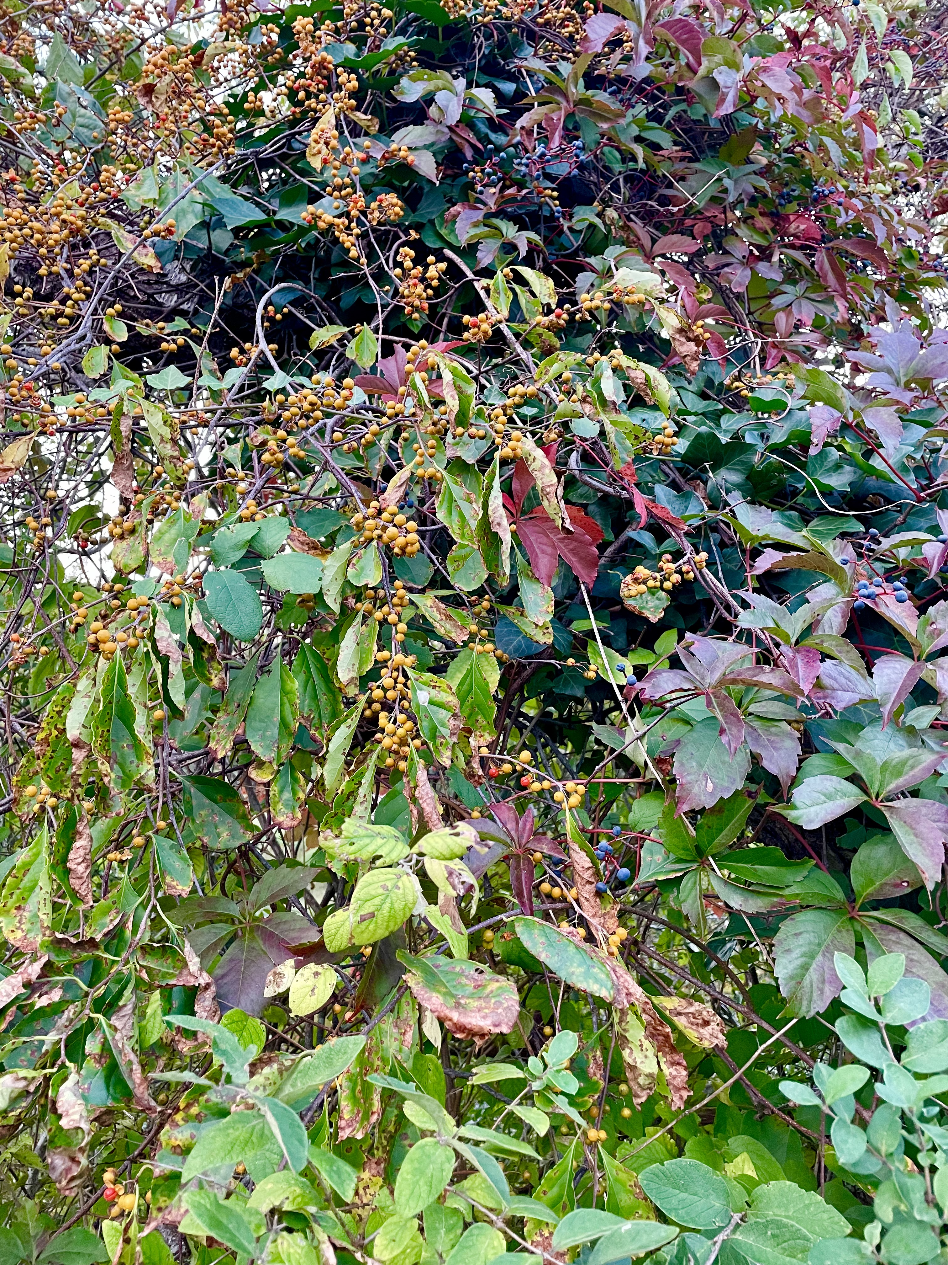 Virginia Creeper (Parthenocissus quinquefolia) feels like it should be an invasive species, but it’s native to the Eastern US. It’s in the grape family, Vitaceae. It produces spectacular color –crimson leaves and blue berries –in the fall.