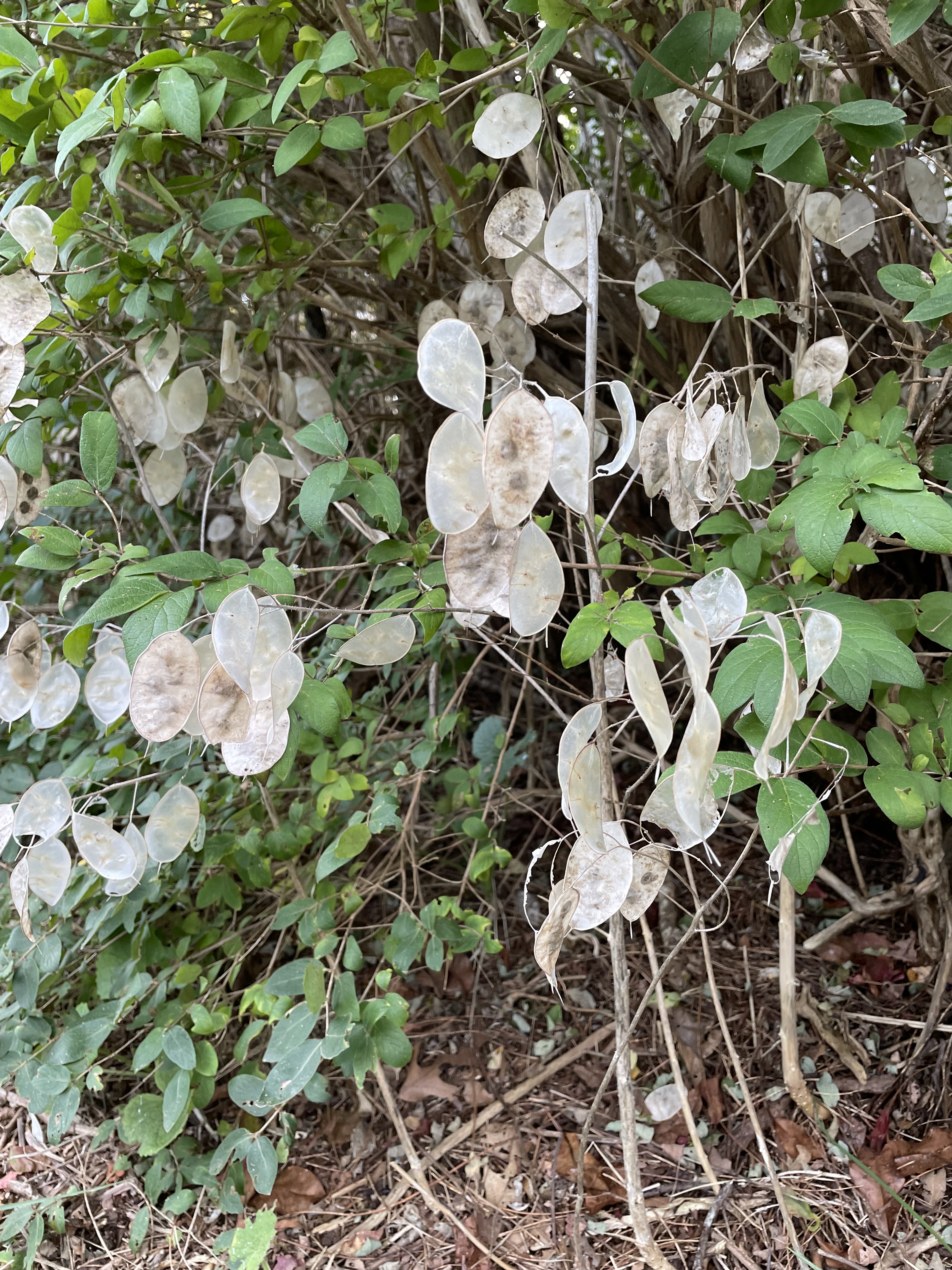 Commonly referred to as Silver Dollar Plant (Lunaria Annua), with bright pink flowers in the spring and translucent seed disks in the fall, it’s a showstopper throughout the garden season. It’s native to Europe and Asia and is a member of the Brassicaceae family. So basically it’s a cousin of broccoli.