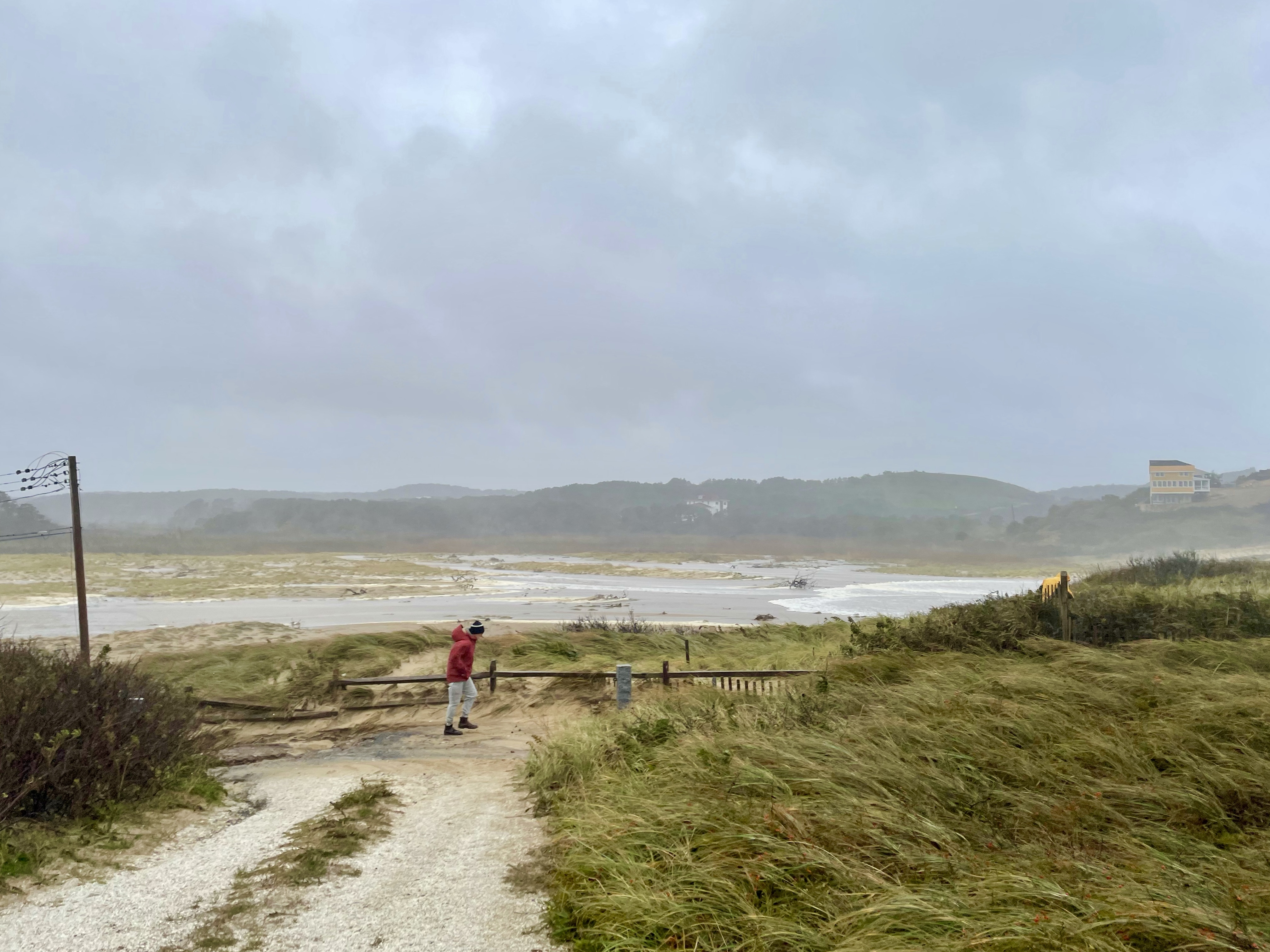I’m not a storm chaser or an adventure hound, but I do like to get a peek at what’s happening. As the storm gathered on Tuesday afternoon, I went to Ballston and Long Nook. The wind was fierce. At Long Nook, where the hollow forms a natural wind tunnel, it was nearly impossible to stand for 15 seconds to make a video. Surprisingly, on the bayside, at Corn Hill Beach, it was almost calm.