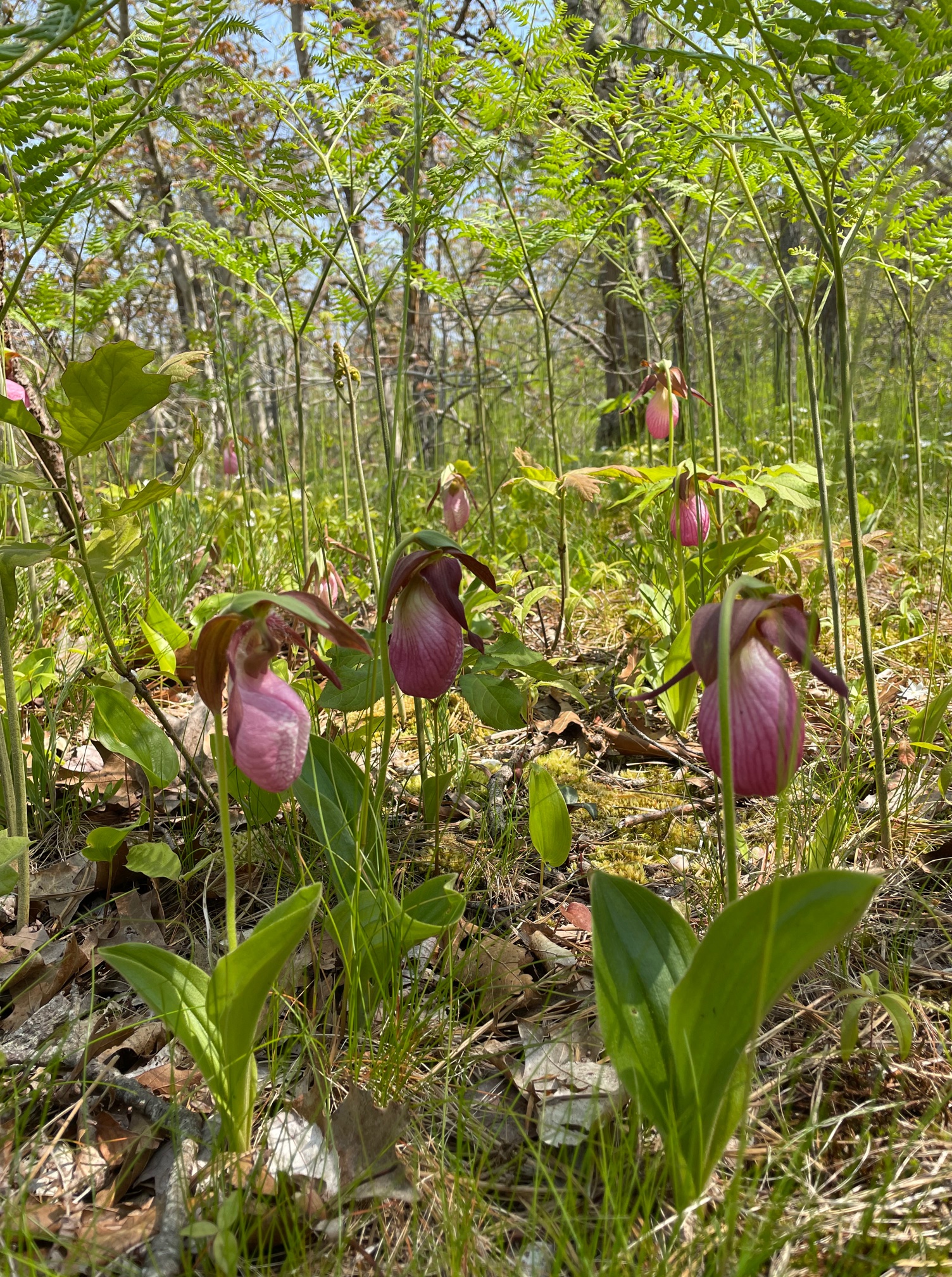 For me, one of the hallmarks of spring’s arrival on Cape Cod is the flowering of our local orchid, commonly called lady slippers (Cypripedium acaule Ait.). Over the past few days, an exuberance of blooms emerged on the old railroad trail in Provincetown. My operative theory as to why they’re so abundant here is the presence of the railroad. For 150 years, this ecology has been relatively undisturbed, allowing the special conditions for the flowers to flourish. Lady slippers are not easily transplanted because they live in a symbiotic relationship with a soil fungus. The US Forest Service explains: