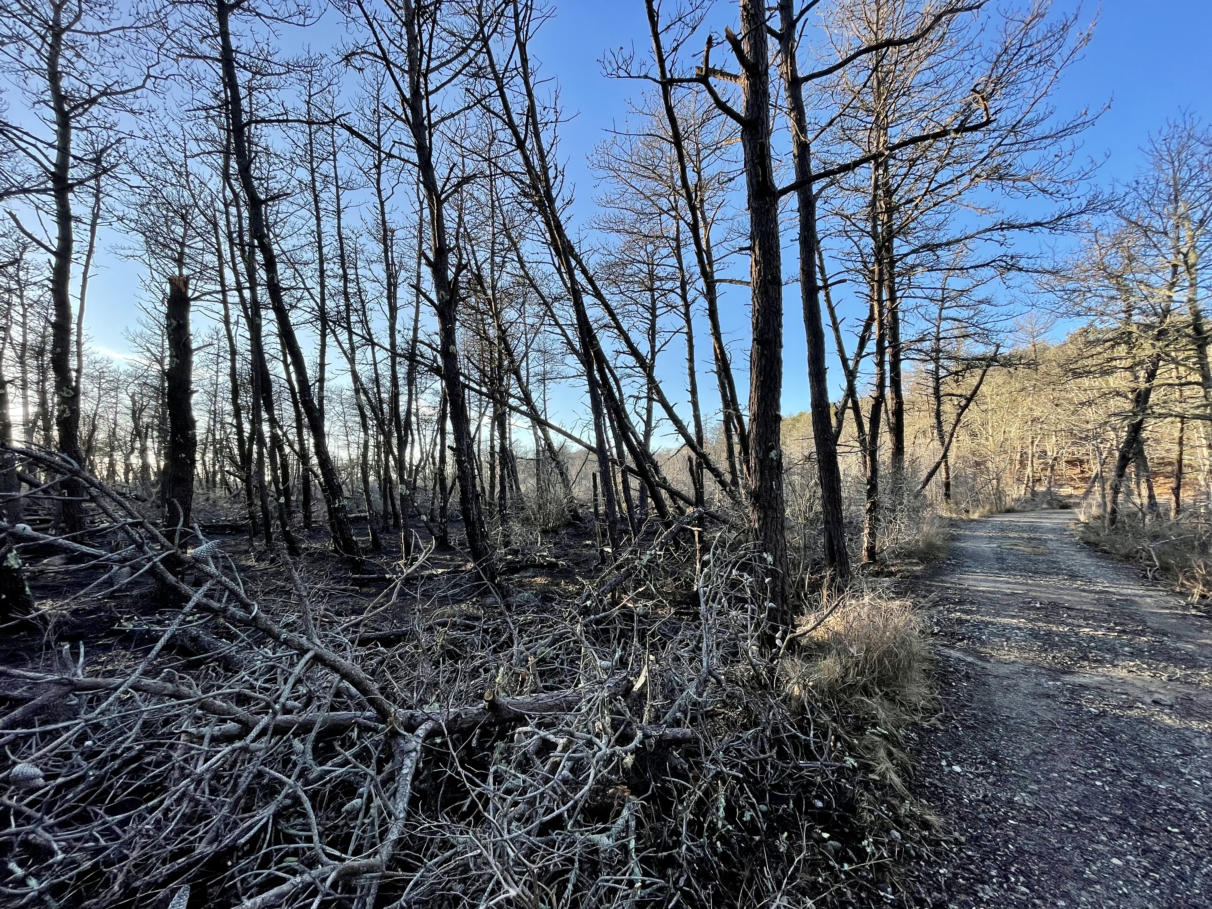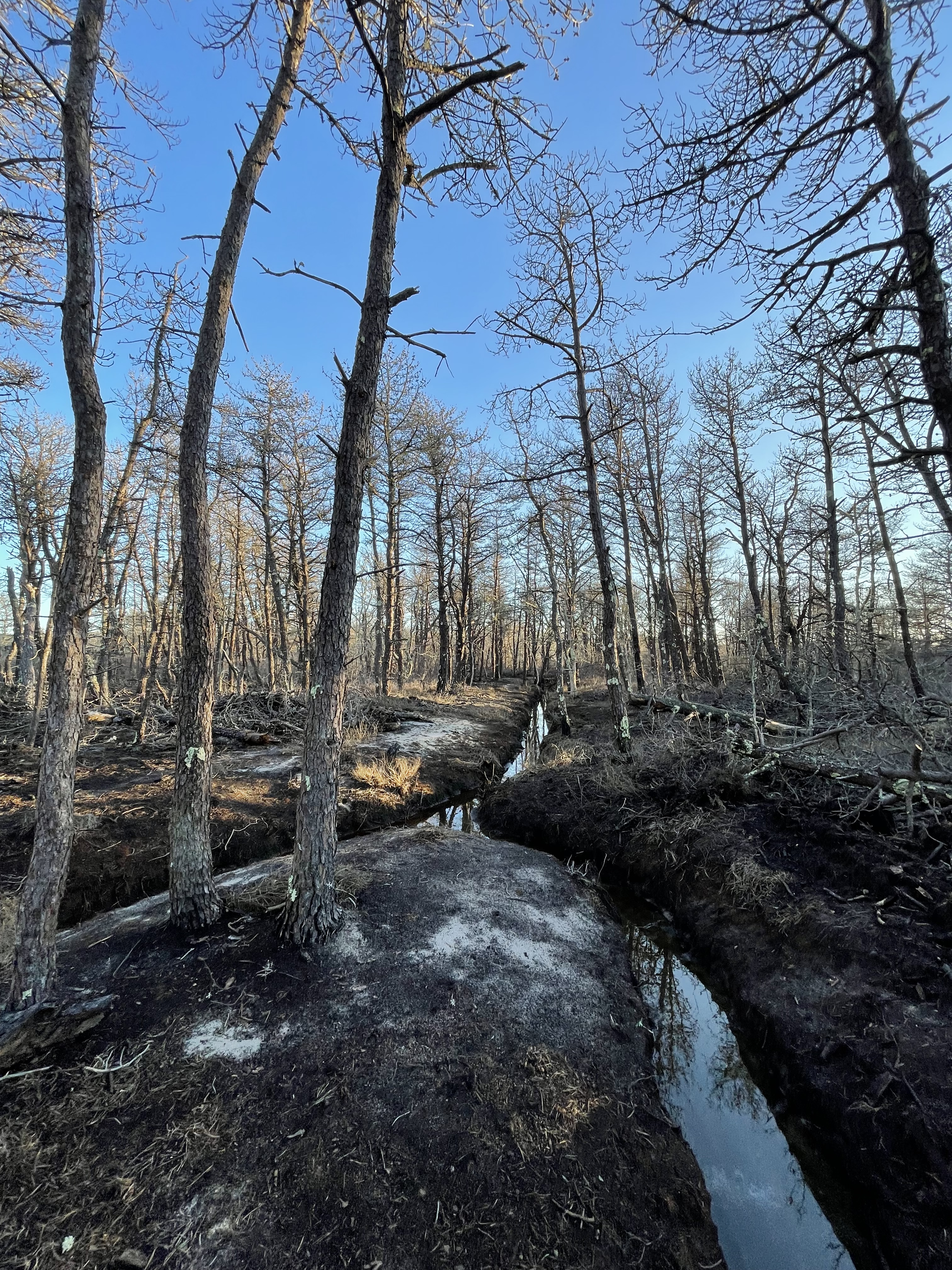 Since the mosquito apocalypse of 2021, I’d been aware of the salt-water wash over at Duck Harbor, the stagnant pools of water that allowed for unusual mosquito breeding, and the efforts to solve the problem. I’d also been vaguely aware of the die-off of plants in the affected area. But the clearing of the briar made the scope of the ghost forest more apparent to me, and I returned yesterday to take a look.