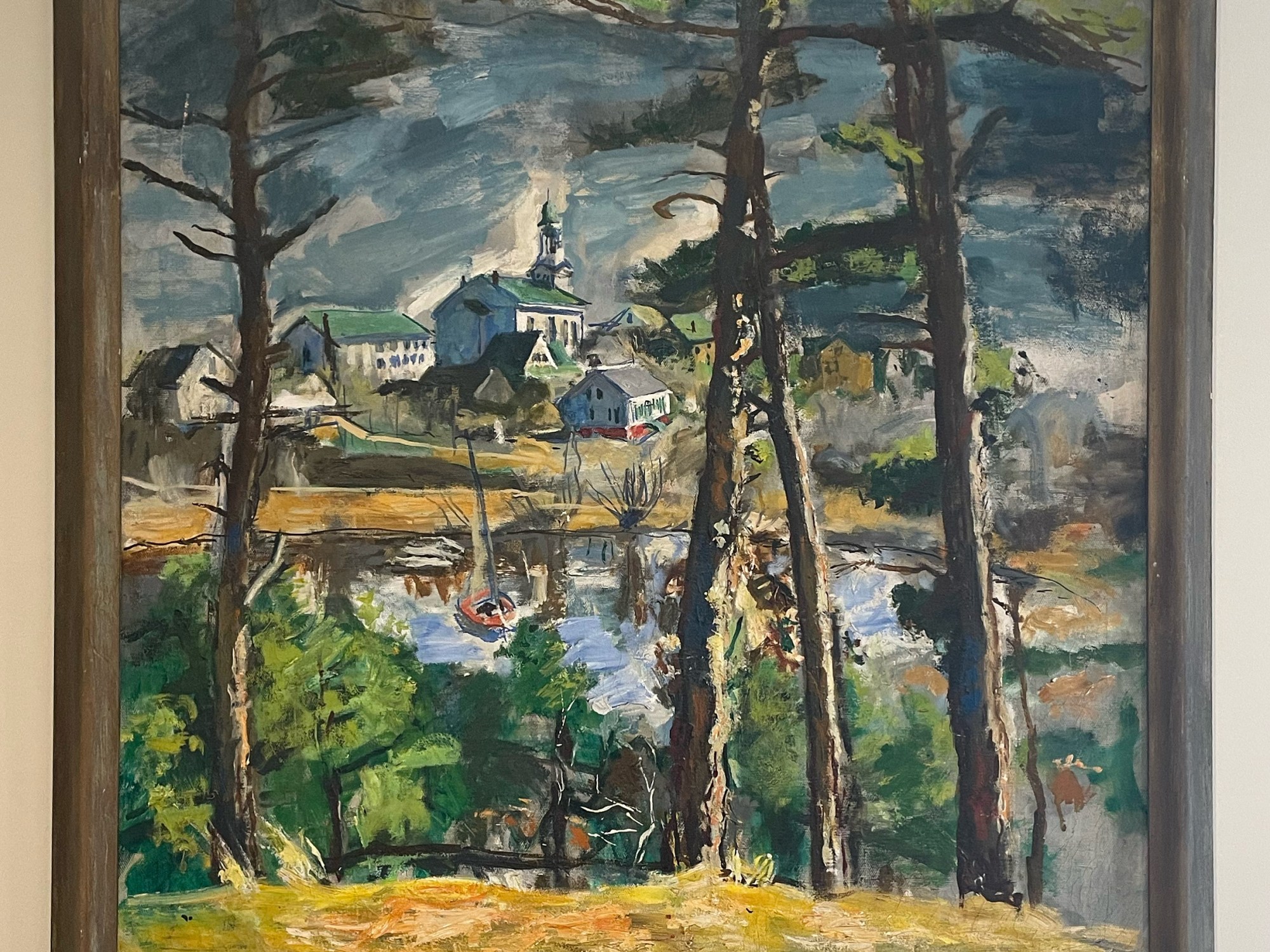 So there’s a painting. It’s by Charles Heinz. For a year or so it hung in the lobby of Seaman’s Bank in Wellfleet. I fell in love with it. Abe Storer wrote about the painting in the Provincetown Independent. Given its view, I had assumed that it was painting from the bank of Hamblen Island. When I was recently talking with Abe, he said he’d made the same incorrect assumption, and that in fact the painting has been made from the back of Squire’s Pond — where a lot of Wellfleet artists used to paint. So on a rainy Saturday, a group of seven of us set out to see Squire’s Pond.